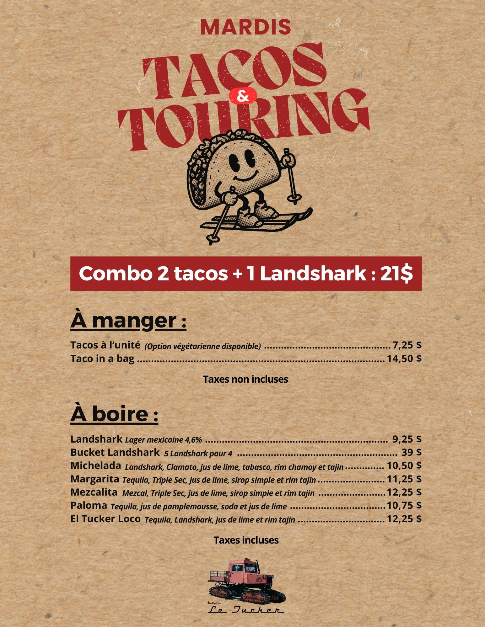 – Combo 2 tacos (viande ou végé) + 1 bière Landshark : 21$ + taxes