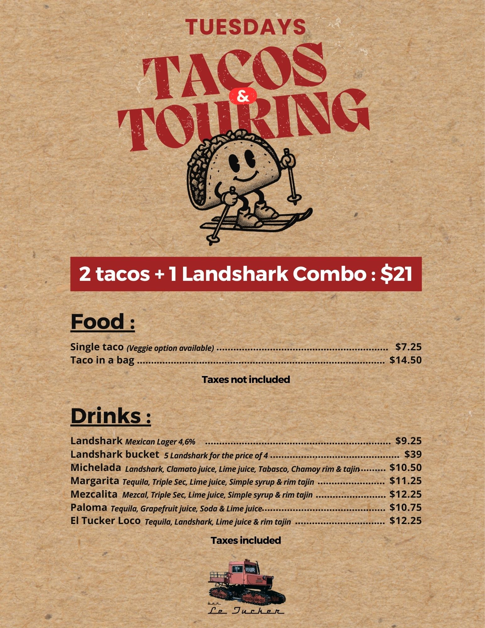 – Combo: 2 tacos (meat or veggie) + 1 Landshark beer — $21 + tax