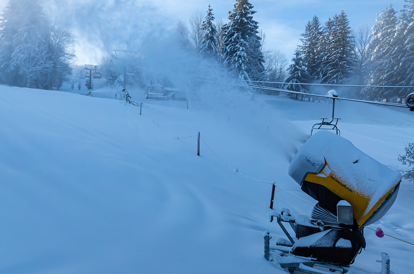 En plus du ventilateur TechnoAlpin fixe sur tour en démonstration pour plus de puissance à la fabrication de neige, un investissement de pas moins de 725 k$ a été fait aux opérations afin d’augmenter la productivité! Ce montant comprend une nouvelle dameuse avec treuil Bison X Winch Stage V qui fera ses premiers tours de pistes sous peu, en plus d’une nouvelle fraiseuse Husky de Prinoth pour la dameuse Sno-Cat 2000 et l’ajout d’équipements roulants. Aussi, tous seront ravis de constater que tous les coussins du Télésiège II ont été renouvelés!